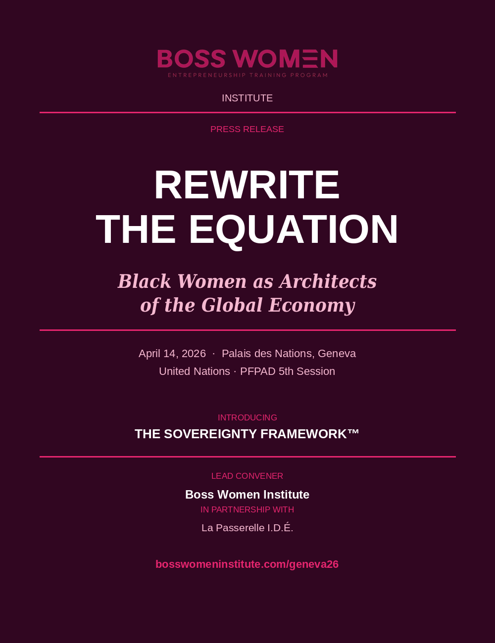 On April 14, 2026, Boss Women Institute convenes a landmark policy session at the United Nations Permanent Forum on People of African Descent, 5th Session — Palais des Nations, Geneva. Co-convened with La Passerelle I.D.É., this session brings together leaders from across the African diaspora to produce concrete institutional change.
